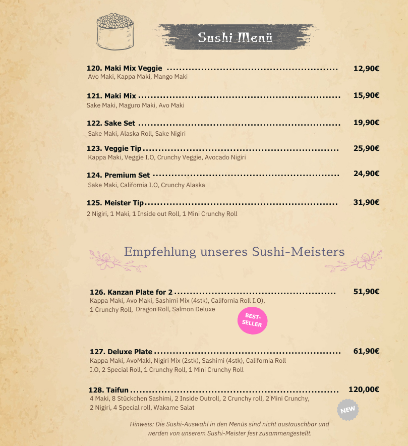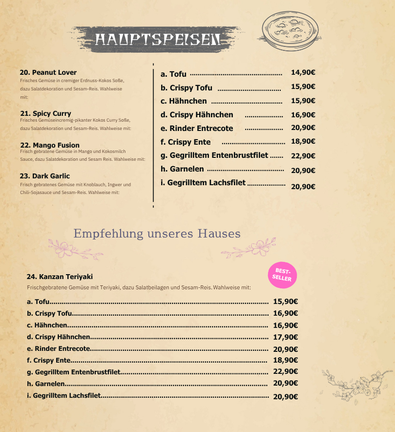 Das Kanzan in Lippstadt vereint die vorzüglichen Spezialitäten aus der japanischen, vietnamesischen und thailändischen Küche in feinster Qualität. Ob nun die traditionelle Tom Yam Suppe, Salmon Bowl, Yaki Udon, Kanzan Teriyaki oder Sushi – Für jeden ist etwas dabei!